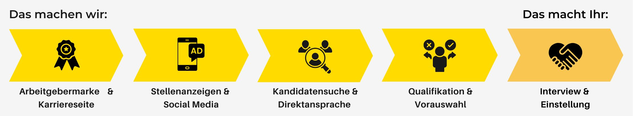 Mit der effektivsten Strategie auf dem Markt helfen wir Euch, planbar qualifizierte Fachkräfte zu gewinnen. Ihr positioniert Euch mit unserer Unterstützung als attraktiver Arbeitgeber und erreicht über unsere ganzheitliche Strategie nicht nur aktiv suchende, sondern auch passiv wechselbereite Kandidaten. So erweitern wir gemeinsam den Kreis der potentiellen Bewerber um ein Vielfaches.